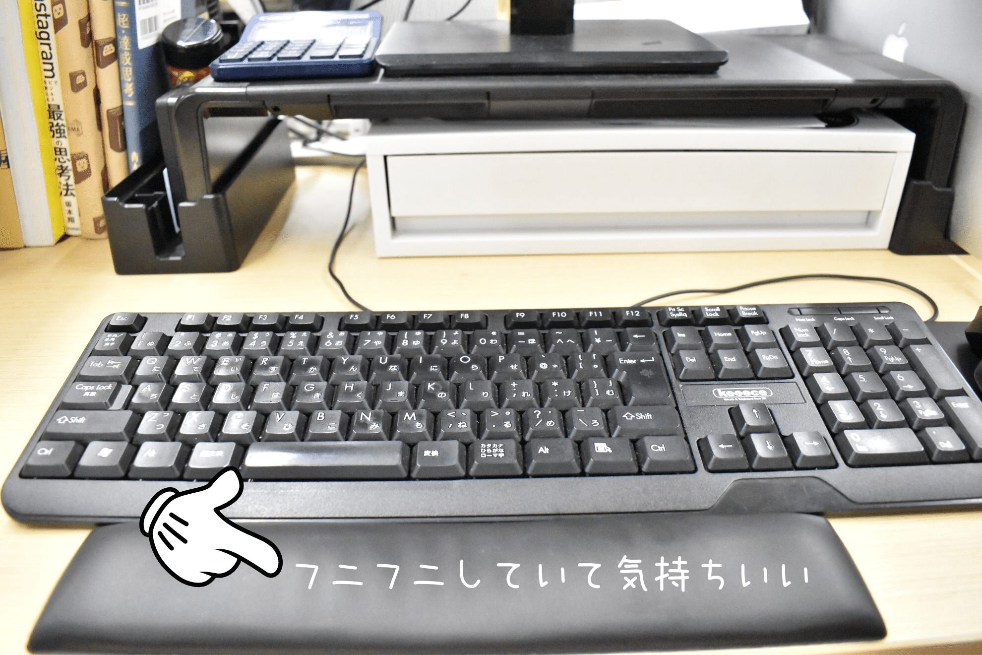 最近手に入れたというリストレスト。全然腕が痛くならないし、絶妙な幅なので手を置く位置が固定されて少ない可動範囲でキーボードを打てる優れものだそう!