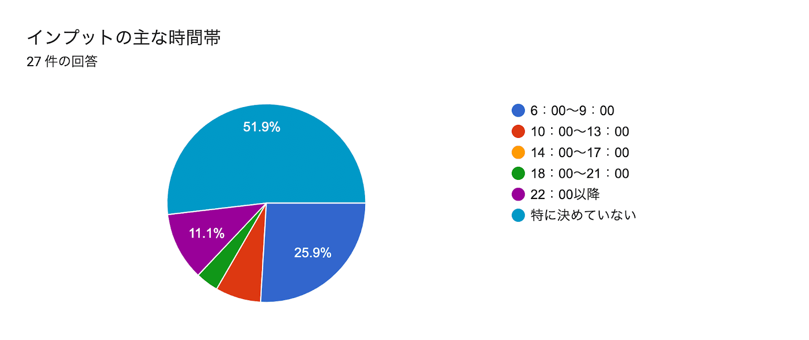 特に時間帯を決めていない方が全体のおよそ半分。やはり目に入ったらインプットする方が多いのでしょうか?次点で6時から9時。朝の生産性は夜の6倍にも匹敵すると言われています。