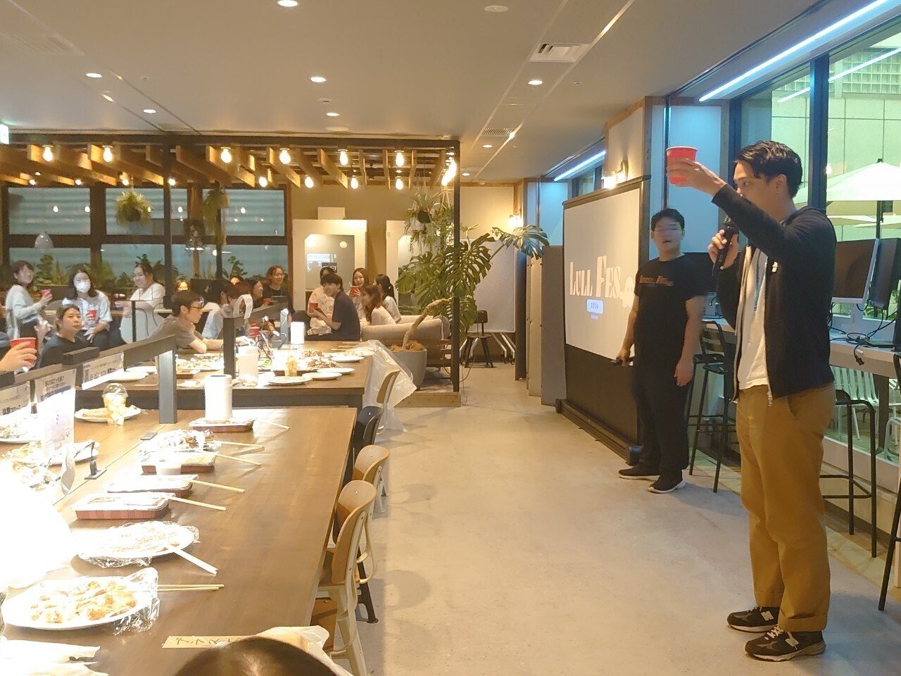 続いて、岡本さんが乾杯の音頭を取り、和やかな雰囲気の中でイベントが本格的にスタートしました。乾杯の瞬間、会場に広がる笑顔と歓声が、LULLの社員たちの仲の良さを物語っています😊