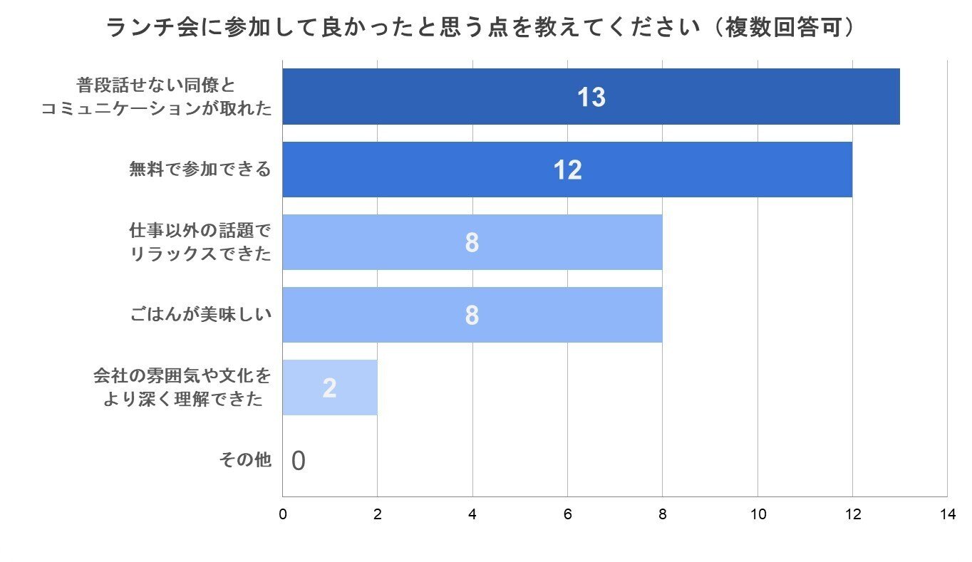 「ランチ会に参加して良かった点」を複数回答で尋ねたところ、以下のような回答が多く挙げられました。
