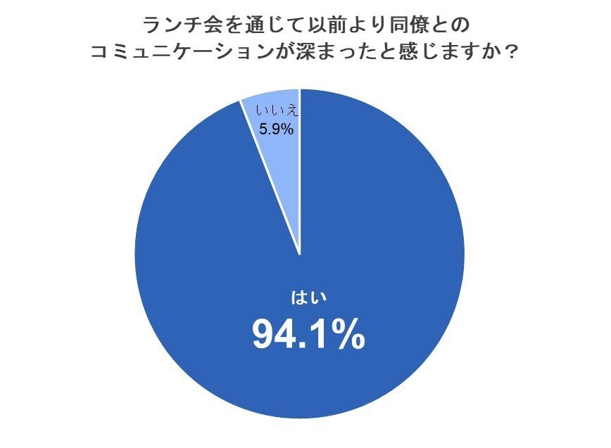 「ランチ会を通じて以前より同僚とのコミュニケーションが深まったと感じますか?」という質問に対しては、94%の参加者が「はい」と回答しました。この結果からも、ランチ会が部署を超えたつながりを生み出し、社内のエンゲージメント向上に貢献していることがうかがえます。
