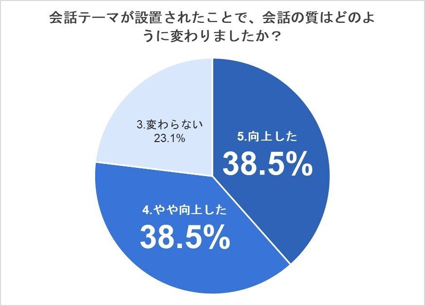 この結果から、77%の参加者が会話テーマの設置によって会話の質が向上したと感じていることがわかります。特に「5.向上した」「4.やや向上した」と答えた割合が同等であることから、会話テーマは多くの社員にとって、会話のきっかけを作り、コミュニケーションを促進する有効なツールとして機能していることが示されています。また、「3.変わらない」と回答した人が23.1%いたものの、ネガティブな評価が一切ないことからも、会話テーマがコミュニケーションの質を損なうことはなく、全体的にポジティブな効果をもたらしていると言えるでしょう。