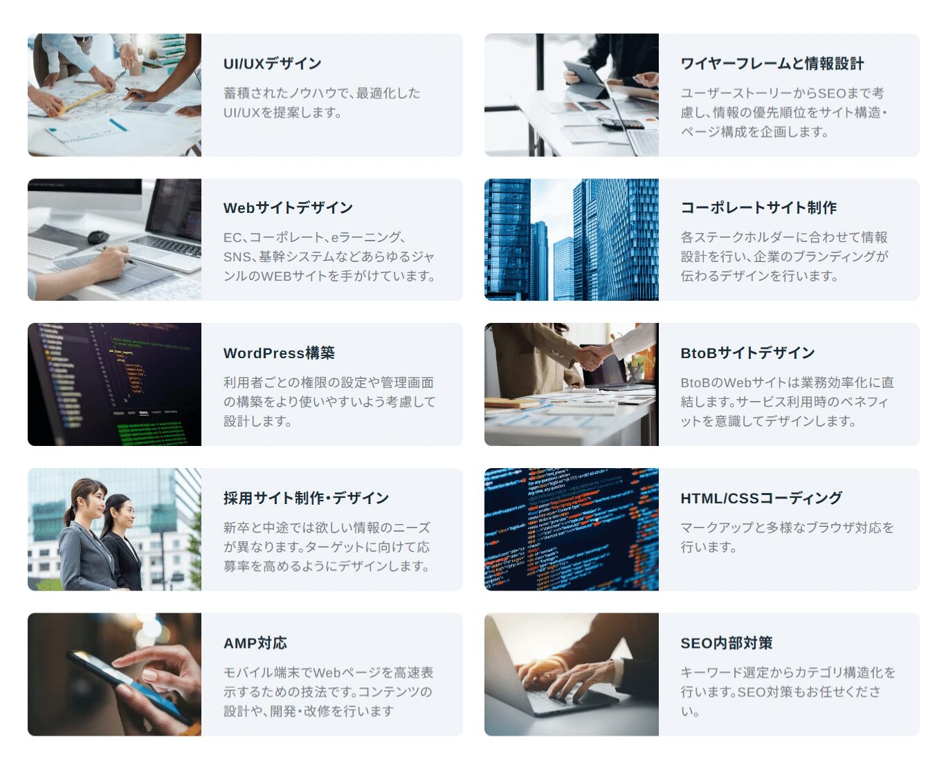 様々なクライアントのデジタル戦略に対して最適なWEBサイトやWEBサービスをご提案し、企業ホームページやUI/UXデザイン、ECサイト、LPなどの開発及び運用面のサポートを提供しています。