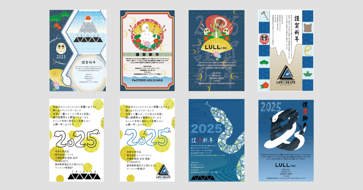 年賀状デザインは送らせていただくクライアント様に合わせてファクタードホールディングス、トリニアス、ライフクリエイト、LULLで1種類ずつ選ばれました!